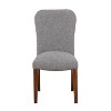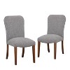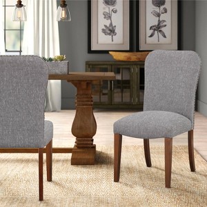 The Salina Ashen Gray Dining Chair has a gently sloped back and front apron, accented with hand-tacked antiqued brass nailhead trim that gives the chair a very tailored look. This style allows versatility for use in the kitchen, dining room or even the office area. The Ashen Gray performance fabric is durable, easy to clean as well as engineered to be stain, odor and moisture resistant. The chair has a kiln-dried hardwood frame for long lasting durability. Your purchase includes two dining chairs.