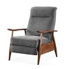 A clean classic recliner is what you get with the Soren wood arm push back chair. Featuring chestnut brown wood arms with tapered legs this comfortable recliner adds a modern look to any room. The stylish charcoal fabric is easy to care for and blends well with most decors.