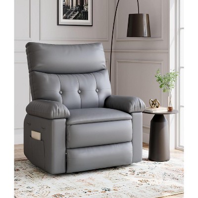 High-Quality Material: Filled with high-density sponge and PU leather surface fabric, the recliner provides the great comfort. Solid frame and metal base make this single-reclining backrest more stable and sturdy enough to hold up to 330 pounds. Refined & Luxury Look: Designed with premium cushion support and thickened armrests, the chair adds a luxurious look to your home theater room, living room, reception room, etc. It can be arranged and reconfigured in various ways to suit different spaces. Reclining & Massage: The recliner chair is powered by electric motor mechanism and can be adjusted from 90 to 165 degrees by remote control. 5 modes and 2-point massage for the waist of the reclining sofa, allowing you to fully relax and decompress. The timing function of the chair can be selected from 15mins/30mins/60mins, allowing you to easily control the massage time. Multifunctional & Easy to Clean: Blue LED lights create the ambiance, 2 cup holders and storage pockets could hold your drinks, magazines and the remote control, saving space. It is made of durable PU leather, which is easy to clean when water spills on the chair.