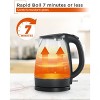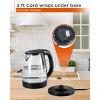 Commercial Chef glass kettle has a 1.7 liter / 57-ounce capacity with easy to clear water level markings. Kettle is BPA-free and scratch and scuff resistant. Features a blue LED light that indicates when contents are boiling. Cordless kettle includes a removable tea filter. The pop-up lid opens easily with a push button for one-handed use. A wide mouth opening allows for easy filling and cleaning. Detachable base for cordless use also allows the kettle to rotate 360 degrees for convenient pour and serve. Auto shutoff and boil dry protection. Convenient cord wraps in base with 1.96 L power cord. 120V, 1500 watt. Measures 8.66 x 6.27 x 9.6. Weighs 2.4 lbs. UL listed.
