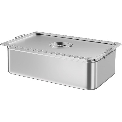 These full-size steam table pans come with tightly fitting lids to keep your food fresh and secure, ideal for restaurants, hotels, and catering events. The stainless steel construction ensures even heat distribution for consistent cooking and reheating, while the sturdy metal design withstands heavy-duty use without warping or bending.