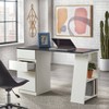 Modern meets function with the Como Writing Desk from Buylateral. An all-inclusive work station which encompasses two storage drawers for office supplies, a lower file drawer for organization as well as a side 2-tier book shelf for binders and such. Featured with a slanted front edge, this desk is constructed of durable MDF in a black and white two-tone finish.