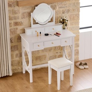 Compact Makeup Vanity Table with Reversible Mirror, Elegant Chic Vanity Desk with 5 Drawers & Upholstered Stool White