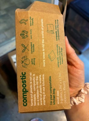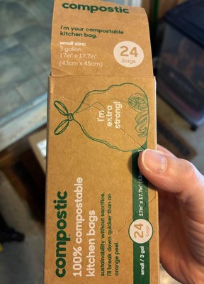 I really liked these compostable kitchen bags. They're excellent quality and very durable. They fit perfectly in my bathroom trash can. They say they're for kitchens, but they're 3-gallon, so I only have that size in my bathroom. They hold a lot of trash. And what I like most is that they're environmentally friendly. I highly recommend them.