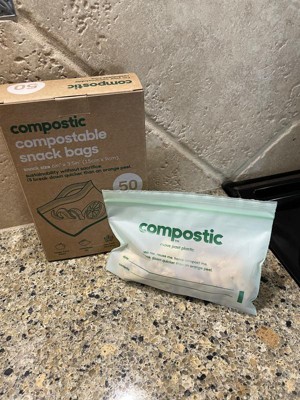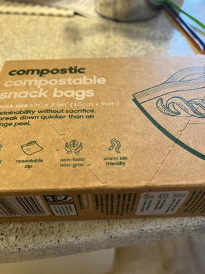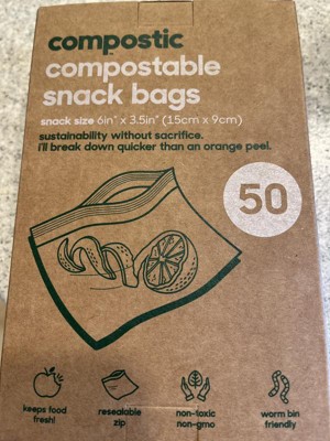 I'm really pleased with these Compostic Compostable Snack Bags. The bags are thick and durable so they will work well for reusing. The zip-close top closes securely and I haven't had to worry about leaks. They are designed to be compostable and break down quickly, which is great for the environment. The only drawback is that they are not see through, but they do have an area to write on that works well. Overall, a really nice quality product that I use often.