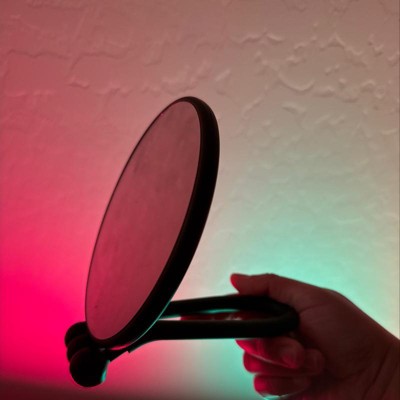 A: This versatile, modern update to a shaving mirror can be hung up, placed on a counter, or handheld.