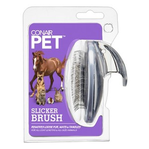 The CONAIRPET Groom-Me Slicker Brush features firm, metal pins that remove mats, tangles and undercoat. With a comfortable, palm-help grip, this palm-held grip mimics a natural petting motion while in-use. Conair® is an internationally recognized and trusted brand that specializes in a wide array of products, including specialty pet grooming tools.