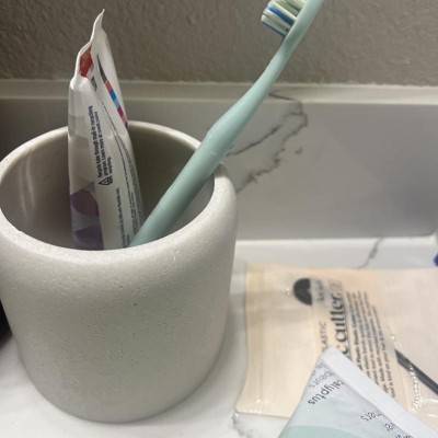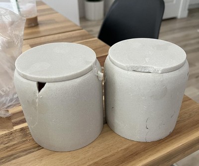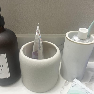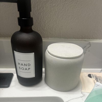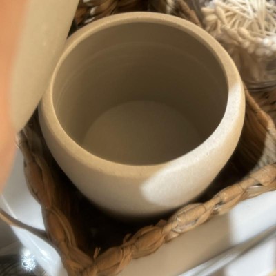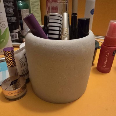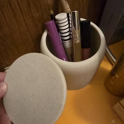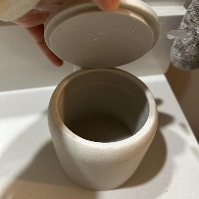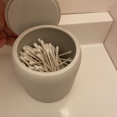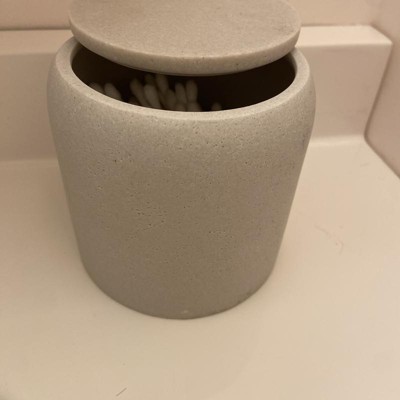 A: Hi, Thank you for your interest in our Concrete Resin Collection Covered Jar - Threshold™. Store bath essentials in modern style with the Concrete Resin Collection Covered Jar from Threshold™. This cream-hues bath canister comes with a lid to help keep the contents neatly contained, from cotton balls to toothbrushes. Made from concrete resin, this lidded jar makes a practical addition to your bathroom. - Lima