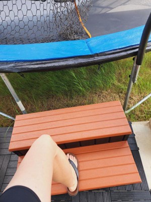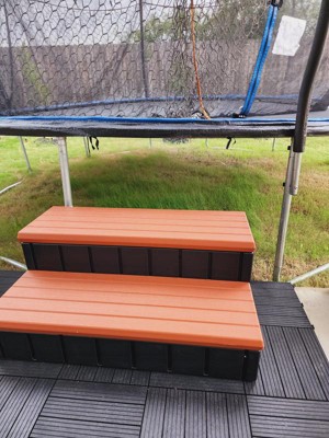 [This review was collected as part of a promotion.] The Confer Leisure Accents outdoor spa steps is the exact item I needed to help my kids and family get a boost to get on different things. Its intended main use is for a spa but these steps are so versatile that we used them to gain easier access to our large trampoline and even some areas of our garage where comfortable steps were necessary. These steps are made from very heavy duty plastic and are 36" long with just the right amount of width. I don't have any issues standing on these as a full size adult and neither do my kids. They are very sturdy and the pads on the bottom add for additional stability. The installation was very easy to put together straight from the box and they even have a QR code that takes you to the video instructions that make it even simpler to follow step by step. Overall it didn't take longer than 15 minutes and only because I was trying to find one of the tools they recommended. It comes in redwood color which accents our patio well with the black tile decking we have on the floor. It has 2 stairs and that's plenty to give me the additional height needed in most instances. My kids love using these as a bench as well as it's wide and long enough for them to sit on while they are still little. Excellent quality and should last a few seasons easily. It's also very lightweight so moving it from spot to spot is not a problem at all.