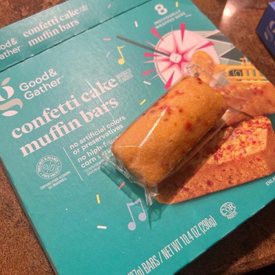 [This review was collected as part of a promotion.] These are the good&gather confetti cake muffin bars. They are a white/vanilla cake with sprinkles. There are 8 in the box individually wrapped. These are moist and tasty, my kids and I all love these. They are perfect with a cup of coffee for breakfast or as a mid day snack. My kids love them for breakfast, in their lunch and especially as an afternoon snack. They love them with or dipped in their yogurt. I received an incentive to write this review.