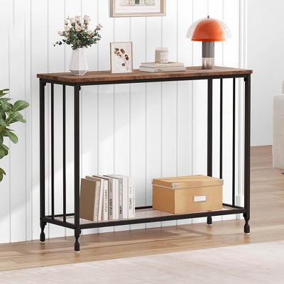 - NARROW CONSOLE TABLE: 33.5”L x 11.8”W x 31.9”H, providing an ideal storage solution that can fit in any narrow space. The 2 open shelves offer ample space for books, plants, lamps, decorations, and more. 4 Adjustable footpads are designed for leveling or uneven, protecting your tile and wood floors from scratches. The sofa table is versatile enough to serve as a foyer or entry table to welcome keys, hats, and other small items or as a behind couch table, Cleaning and maintaining it is a breeze.