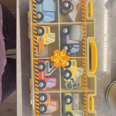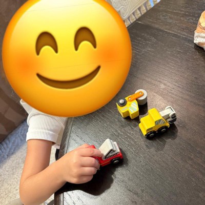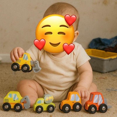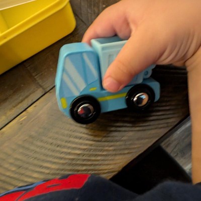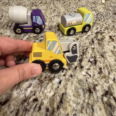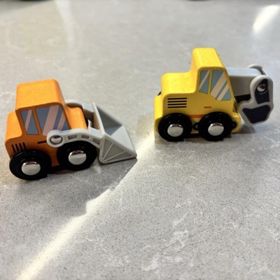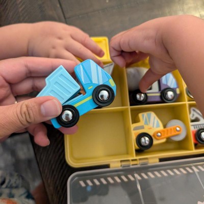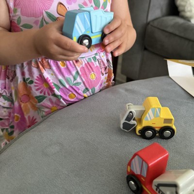 A: The construction cars are primarily made of wood, ensuring durability and safety for young children.