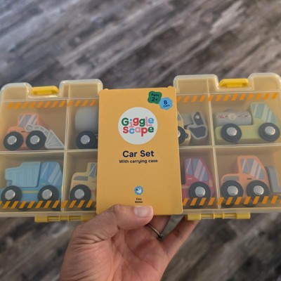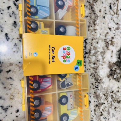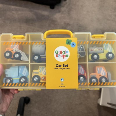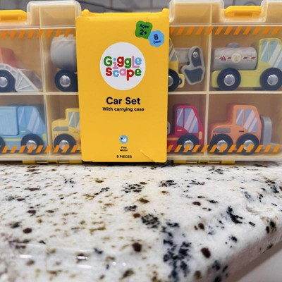 A: Hi Jen D - Thank you for reaching out. We appreciate your interest in Construction Car Set. Yes, construction Car Set will likely fit on Gigglescape train tracks because Gigglescape is a brand of wooden train set, and most wooden train sets are designed to be compatible with each other. This means the Gigglescape train cars, which run on tracks, should be compatible with the wooden tracks of the same brand. I hope this helps - Emma