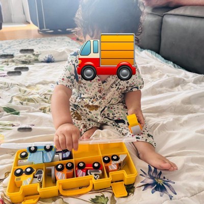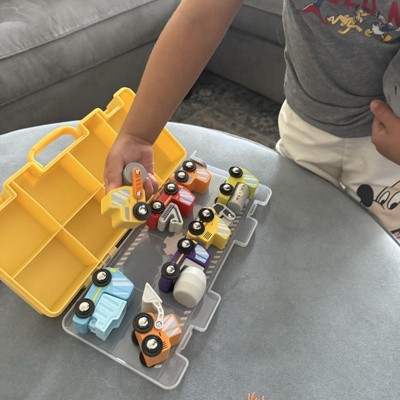 A: Hi, Sandy - Thanks for asking! This 9-Piece Endcap Construction Car Set is made of wood. These cars are not designed for and are unlikely to work properly on a magnetic tile race track system. Have a great day! -Ryan