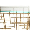 - •Rectangular console table features a matte metallic gold aluminum body with textural grain details, and a transparent tempered glass tabletop