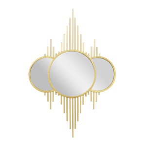 - •This unique round wall mirror features 3 overlapping round mirrors with a gold frame and a diamond-patterned exterior design
