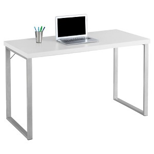 This sleek and contemporary bright white work desk is the perfect combination of function, durability and design in a modern form. With clean lines, thick panel construction and silver track metal legs, this desk will add pizzazz to any home office. The desk top provides the ideal surface space for a lamp, picture frames, laptop or tablets to meet your working needs.