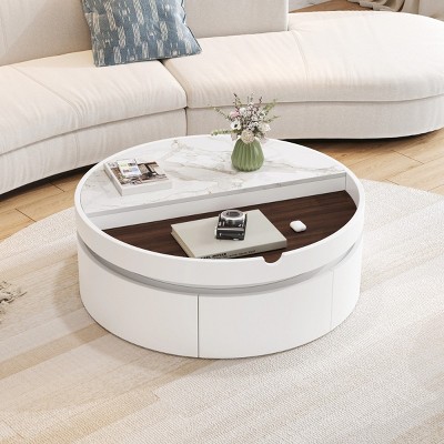 Maximize functionality and elevate your living space with this modern round lift-top coffee table set. Designed with clean lines and a balanced circular shape, this 31.5-inch table features a lift-top mechanism that transforms the surface into a comfortable height for working, dining, or casual activities. Beneath the lift-top lies a spacious hidden storage compartment—perfect for keeping books, remotes, and everyday items neatly tucked away. The set also includes three matching ottomans that nest seamlessly under the table when not in use, offering space-saving convenience. Each ottoman doubles as extra seating or a footrest, making it ideal for entertaining or relaxing. Built from durable MDF with a smooth finish, this coffee table set blends contemporary form with practical design. Its refreshing color contrast adds visual interest to modern interiors, while the multifunctional features make it a smart centerpiece for apartments, small homes, or family rooms. Easy to assemble with included instructions.