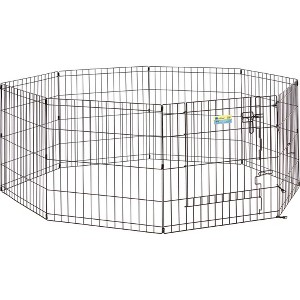 The metal Exercise Pen / Pet Playpen by MidWest Homes for Pets provides a great enclosure to keep your pet safe and secure while indoors or outside. These Exercise Pens / Pet Playpens are made of durable metal wire that features a black E-coat finish for long lasting protection against rust and the elements. When fully expanded, the Exercise Pen / Pet Playpen provides your pet with 16 square feet of enclosed living area. Each durable metal Exercise Pen / Pet Playpen is simple to set up (no tools required) and includes 8 ground stakes for secure set-up while being used outdoors and 4 thumb-snaps for easy assembly. These versatile Exercise Pens / Pet Playpens can be used for a variety of pets and fold flat for convenient storage when not in use. Make sure to check out the additional Sunscreen or Wire Mesh Top for the Exercise Pen / Pet Playpen if you want to add additional security or shade to the pen when using it outdoors.