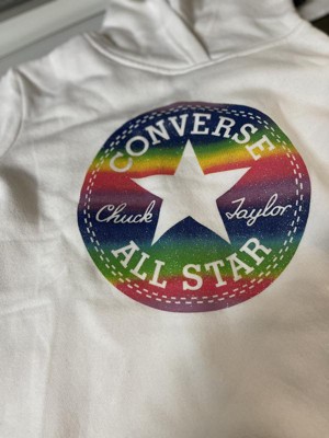 [This review was collected as part of a promotion.] Got this hoodie for my 4 years old. The white color really makes the rainbow color design on the Converse logo really stand out. The material is comfortable and the fit is true to size. The only thing I wish was different is that the bottom doesn't hug in like most hoodies. But the design is still really cute.