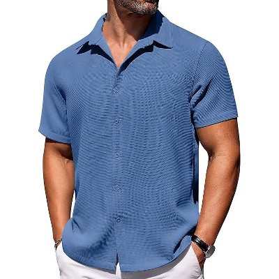 COOFANDY Men's Cuban Guayabera Short Sleeve Button Down Casual Summer Beach Linen Shirts Blue M