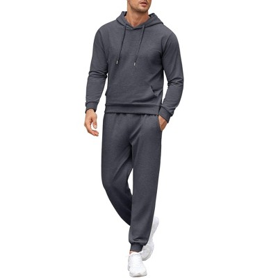 • Men's tracksuit set including hoodie and sweatpants. Solid color drawstring hooded pullover with kangaroo pocket; pants with adjustable drawstring, 2 side pockets for you to carry keys, cell phone and other small items etc