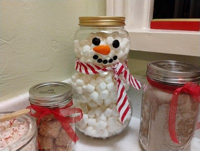 LOVE this large snowman shaped jar! I just wish they had it this size in glass!!! I filled it with marshmallows, and painted the embossed eyes, nose, and mouth and put a seal coat on top. Then I added a ribbon like a scarf and it was the perfect addition to our hot chocolate bar this year!