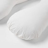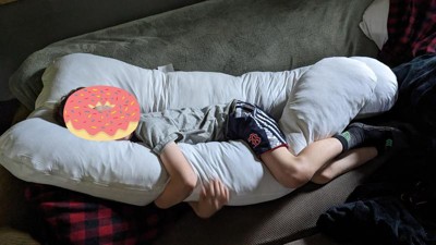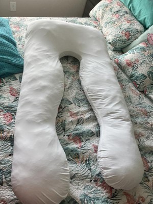 A: The body pillow is designed in a U shape, providing support for pregnant individuals.