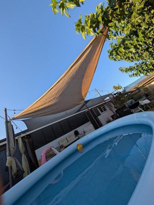 [This review was collected as part of a promotion.] The Coolaroo triangle sun sail turned my sun-scorched patio into a shady little oasis! Install was simple (thank you for including the hardware 🙌). It holds up like a champ in the wind and looks way more expensive than it is. The fabric breathes, so it cools the space without making it feel like a hot tent. Definitely recommend.