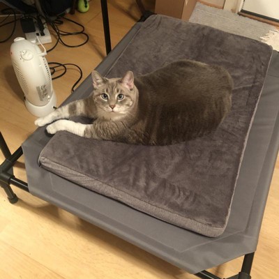 [This review was collected as part of a promotion.] I actually bought this cot for my kitties. I’ve got two, so I figured they could both lounge on here together. I added a memory foam mattress pad for them during the winter and I’ll remove it during the summer. It’s definitely big enough for two cats. I think a medium-largeish dog would fit alright. Maybe with less room to stretch out. You’ll need a decent amount of space for this because it is fairly wide. It’s tight to snap it together, but it feels very sturdy, yet incredibly lightweight. I haven’t tried the cooling feature, but it needs water added to properly work, which I didn’t realize and I think is important to note. I’ll try that when it gets warm and they like to lounge in the sun. It’s about 6 inches off the ground, which seems high enough. Overall, I definitely recommend this product! It seems sturdy enough for a substantial sized pet and the material is quality!