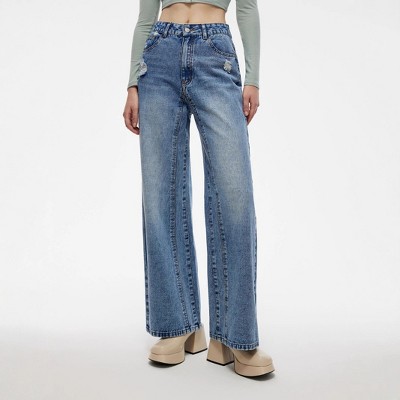 Coolmee Straight Leg Jeans for Women Fashion Mid Rise Stretchy Back Butterfly Print Jeans Trousers with Belt M Light Blue