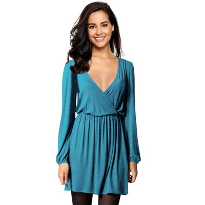 Coolmee Women's Dresses Wrap V-Neck Casual Ruffle Long Sleeve A-Line Mini Dress Dark Blue XL