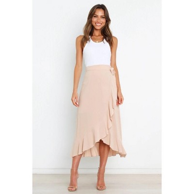 Coolmee Women's Ruffle Wrap Skirt Tie Waist Boho High Low Asymmetrical Midi Beach Skirt Beige S