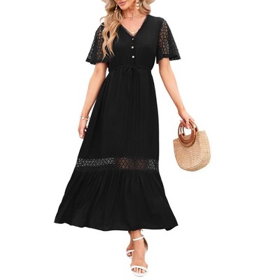 Introducing the Women's Short Sleeve Maxi Dress, a versatile and elegant addition to your wardrobe. This dress features a V-neckline, short sleeves, and a high waist design with delicate lace detailing, creating a chic and stylish look. The flowy A-line silhouette adds a touch of sophistication, making it perfect for casual occasions or beach outings. This dress is a fashionable and comfortable choice for a variety of events.