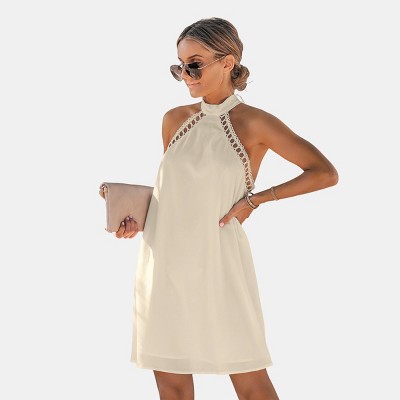 - Features: Sleeveless, cut-out twist front, ruched detail, bodycon fit, mini length