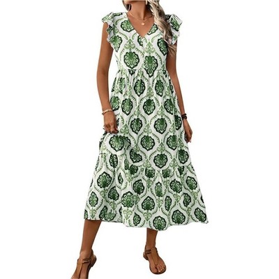 - Features: Wrap design, V-neck, ruffle cap sleeves, A-line fit, pleated hem, midi length