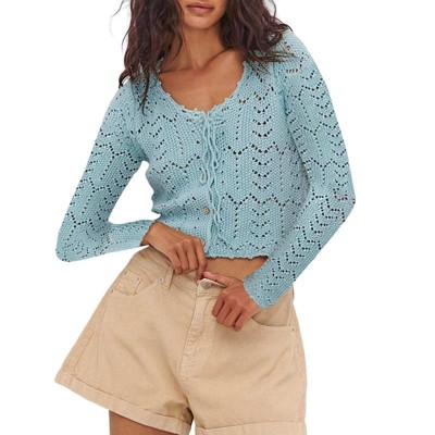 Coolmee Women's Tie Front Cardigan Long Sleeve Rib Knit Shrug Sweaters Crop Tops - 1 of 4