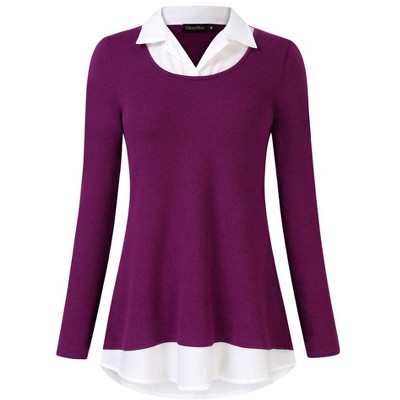 Coolmee Women's Tunics Tops Long Sleeve Contrast Collared Shirts Patchwork Work Blouse Tunics Tops