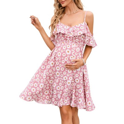 Celebrate your pregnancy glow in this versatile maternity mini. The V-neck and smocked top accommodate changing curves, while ruffle embellishments add celebratory charm. Designed for baby showers, maternity photos, or summer gatherings—this dress grows with you while maintaining polished style.