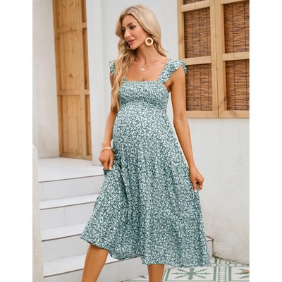Coolmee Womens Plus Size Summer Midi Dresses Casual Ruffle Sleeve Tiered Swing Sundress with Pockets XL Green Flower