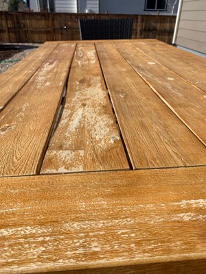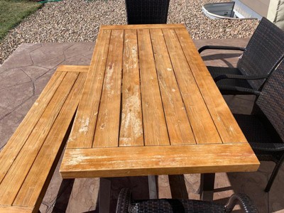 This set looks great, however, is NOT weather resistant. We purchased in July 2019 and used for one summer/fall. In winter, we stored outside but with a table cover over the table. This spring after taking the cover off the table, we noticed LOTS of paint chipped off and the wood even warped in one spot. We are super disappointed to have paid $700 for a set that now is uneven and no longer looks as it did 9 months ago.