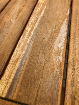 We live in Montana. This set was used for 3 months and then stored away in the shed during winter. We just pulled it out and noticed the protective coating is peeling/wearing away. I now have to sand this down and paint clear coat on it so it can last longer. I feel this set is not weather resistant at all and this description is very mis-leading.