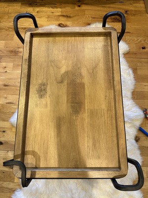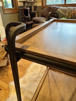 A sweet little cart that’s one-part industrial charm, one-part upscale hotel. The Cooper bar cart has a black metal frame that leans on urban architectural inspiration. Solid wood trays offer down-home, rustic appeal with their natural figuring and enhanced grains. Find a home for this versatile furniture piece in most any room. We’ve seen it expand storage space in a galley kitchen to hold a microwave, fruit bowl and spices; in a bathroom, it displays toiletries, candles and rolled towels for a spa-like effect. But what this small bar cart loves most is a good party. You can easily roll this cart out to your soiree space when it’s time to serve guests drinks and hors d'oeuvres with a smile, and there’s plenty of room for that ice bucket and cocktail napkins too. The side lip of the trays keeps everything neatly in place, and two of the wheels lock for added security.
