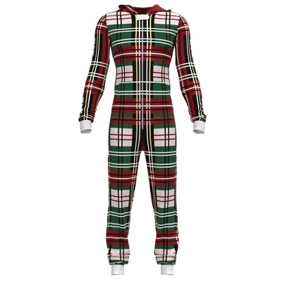 Adult Men's pajama jumpsuit in our super soft 95% cotton knit and 5% spandex with hood and kangaroo pockets.