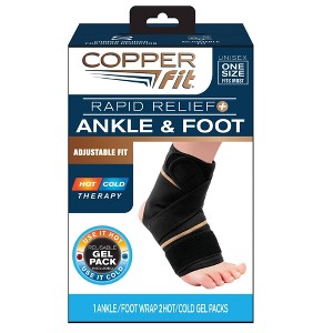 Copper Fit's Rapid Relief features one size fits most ankle and foot wrap that holds a Hot/Cold gel pack in an interior pouch. Hot/Cold therapy may help reduce muscle and joint pain, soreness and aches, and other foot or ankle pain. Now, you can get the ankle support you need while providing ice or heat therapy.