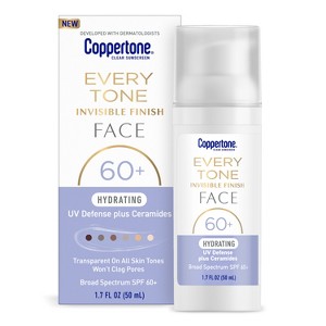 - One 1.7 fluid ounce pump bottle of Coppertone Every Tone Invisible Finish Hydrating UV Defense Face Sunscreen SPF 60+