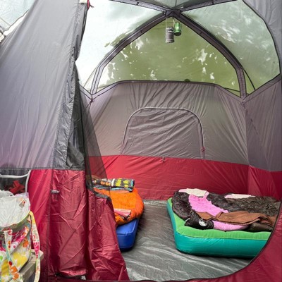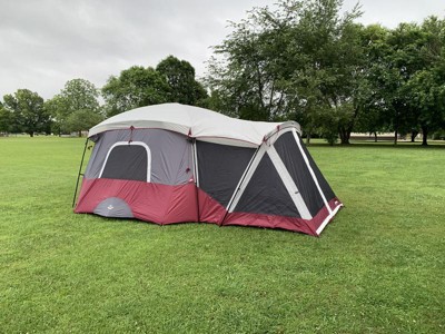 Spacious camping tent has a 7-foot center height and sleeps up to 11 adults with their gear comfortably