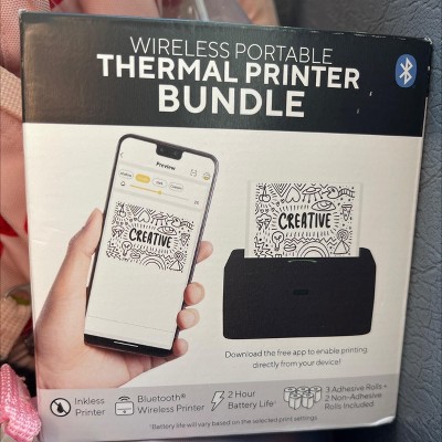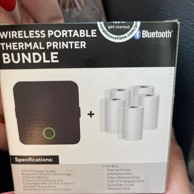 - All-Inclusive Package: Mini Thermal Printer, 3 Adhesive Rolls, 2 Non-Adhesive Rolls, a USB-C Charging Cable, a Quick Start Guide, & Warranty Card.