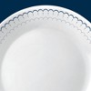 Crisp cottage textiles with delicate scalloped trim brings a gentle charm to this dinnerware set. Dishes in clean white with navy detailing feel airy and relaxed, and the perfect color palette for any setting.