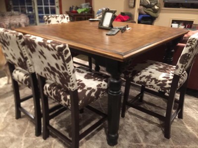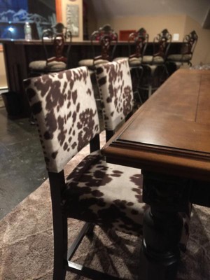 A: LES, Thank you for your interest in the Corey Counter Stool. The finish on the brown cow print stool is an espresso color. The black cow print and gray have a black finish on the legs.